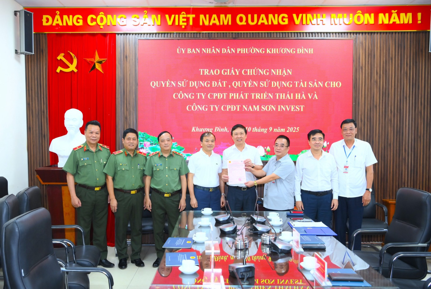 Ủy ban nhân dân phường Khương Đình trao Giấy chứng nhận quyền sử dụng đất, quyền sở hữu tài sản gắn liền với đất cho Công ty cổ phần đầu tư phát triển Thái Hà và Công ty cổ phần đô thị Nam Sơn Invest.